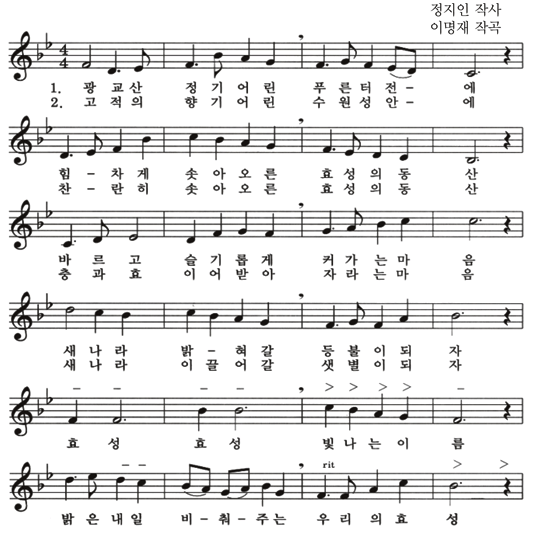 청운의 꿈을 펼쳐 나라에 충성하고 부모에 효도하고 형제간에 우애를 돈독히 하자는 뜻을 담고 있음.